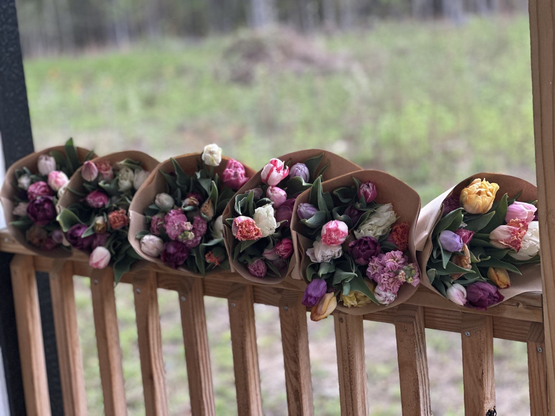 Each bouquet is wrapped and thoughtfully designed with the freshest blooms growing that week. One of our goals at Estes Farm is to grow flowers you won’t find in grocery stores—specialty tulips and daffodils, unique fillers, and beautiful foliage that make every bouquet feel special.